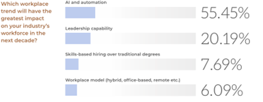 On the one hand, just 9.2% of people said they were concerned about AI’s potential to replace people. Somewhat paradoxically, however, when asked about the biggest impacts on the workforce in the next decade, AI and automation came in firmly at the top of the list.