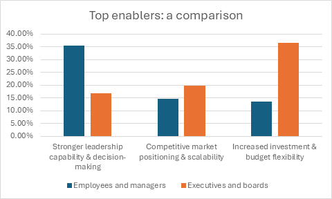 One of the most salient findings was a stark disconnect between what middle managers saw as priorities for future enablement as well as leadership development, versus what top executives identified as most important. Where more than a third of middle managers surveyed identified stronger leadership capability and decision-making as a key enabler for their company’s future, only 17% of executives agreed. Instead, nearly 37% of executives identified increased investment and budget flexibility as the top enabler, as opposed to just 14% of middle managers.