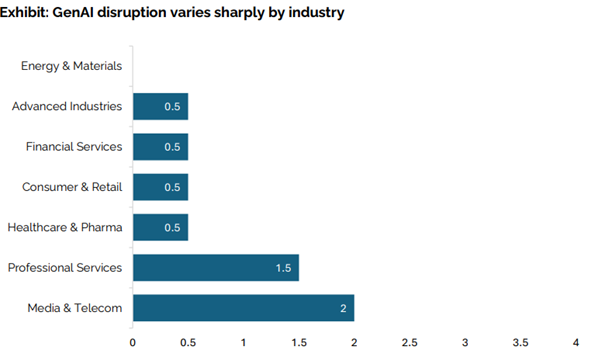 MIT’s research scored the healthcare and pharma industry just 0.5 out of a possible 5 for Gen AI disruption, on factors include emergence of new AI-driven business models and changes in user behaviour attributable to GenAI, including cognitive off loading and automation bias, even by users considered experts in their fields.